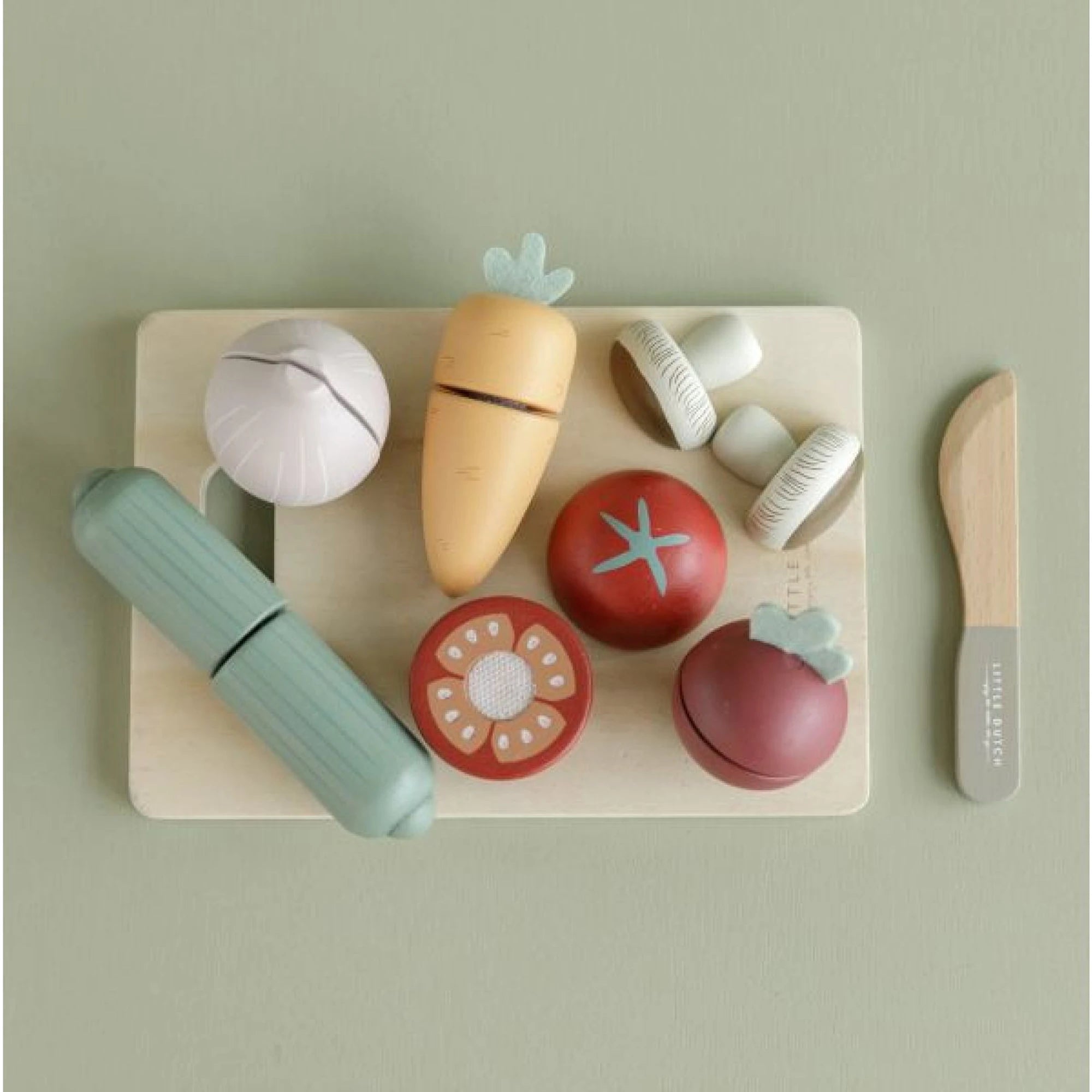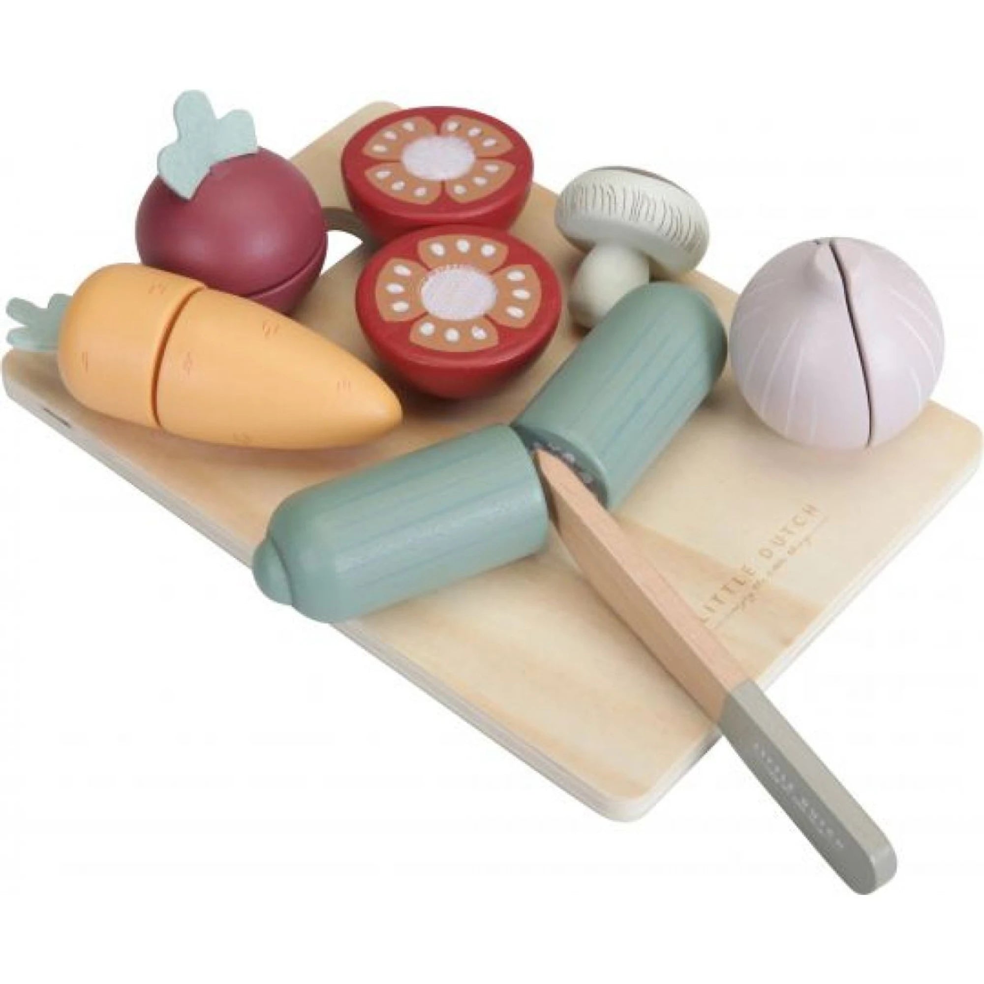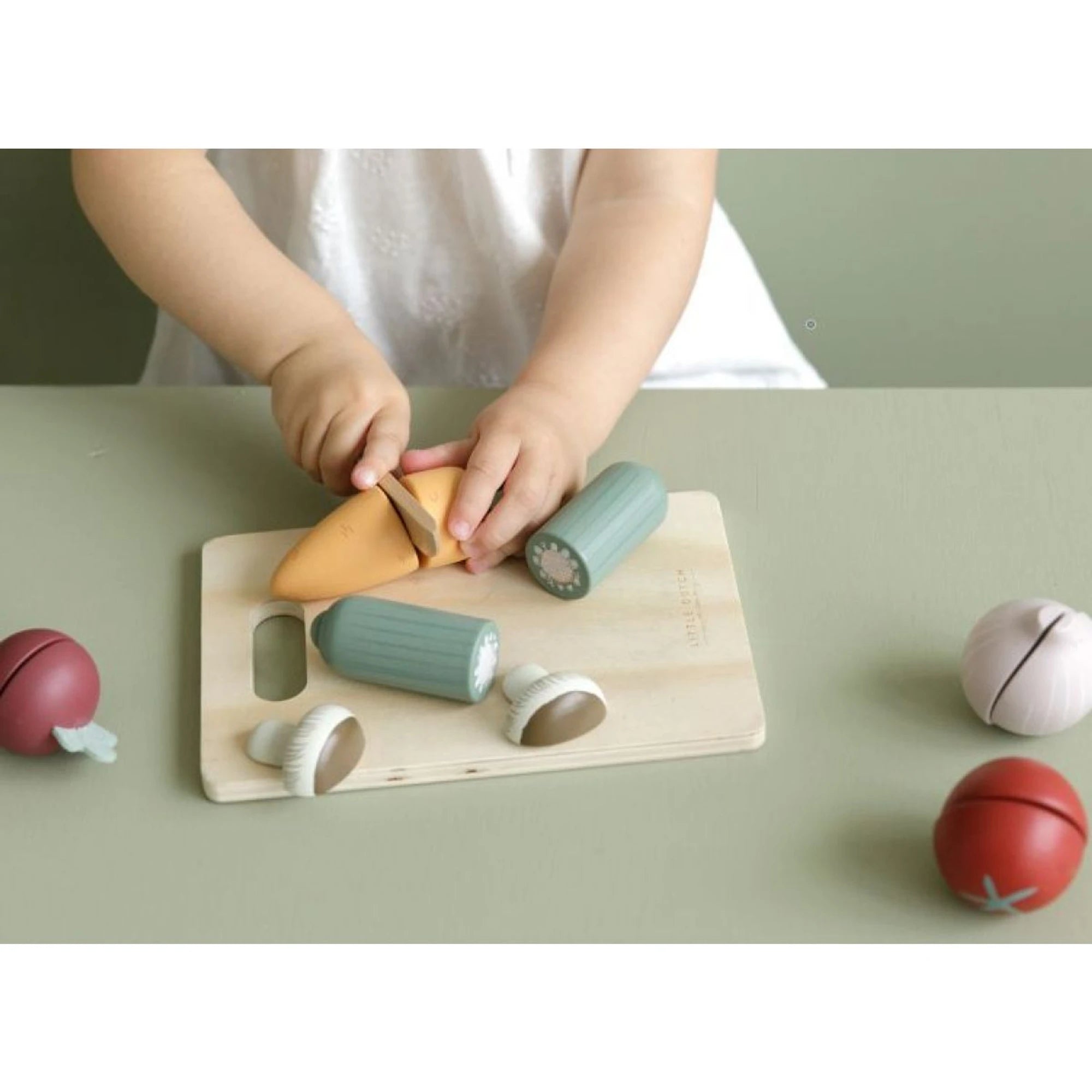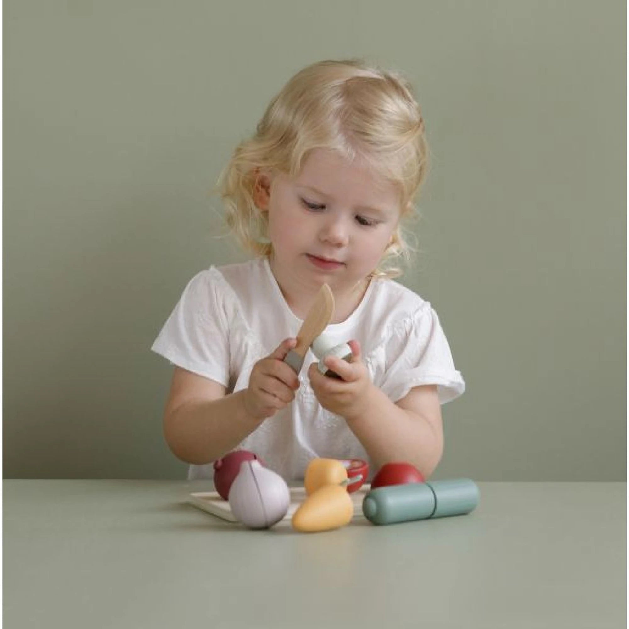 Legume pe tocător, cu care copiii se pot juca de-a tăiatul și servitul pentru prietenii din cameră. Înjumătățirea legumelor cu cuțitul din lemn este sigură pentru cei mici – fiecare bucată e formată din două piese prinse cu arici.